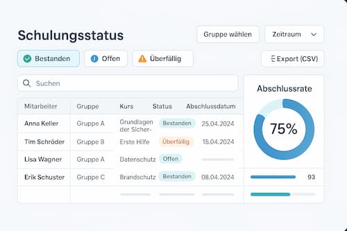 💡 Tipp: Nutzen Sie diese Seite regelmäßig, um den Schulungsfortschritt im Unternehmen im Blick zu behalten und gezielt zu reagieren – ob bei Neueinstellungen, Pflichtunterweisungen oder wiederkehrenden Schulungsterminen.
